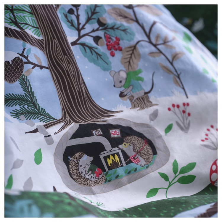 روی این روتختی نرم از جنس پنبه/ویسکوز با طرح چاپی در دو طرف، سمور آبی به همراه توله کوچکش شنا میکند در حالی که سیاهگوش به آنها نگاه میکند. جوجهتیغیها در لانه زمستانی خود زیر درخت با آتش گرم میشوند.
