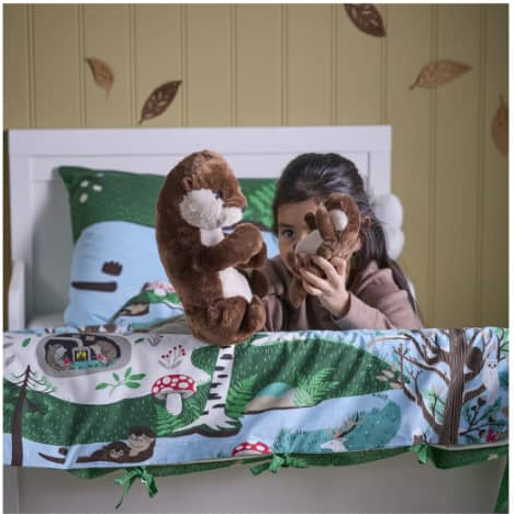 روی این روتختی نرم از جنس پنبه/ویسکوز با طرح چاپی در دو طرف، سمور آبی به همراه توله کوچکش شنا میکند در حالی که سیاهگوش به آنها نگاه میکند. جوجهتیغیها در لانه زمستانی خود زیر درخت با آتش گرم میشوند.