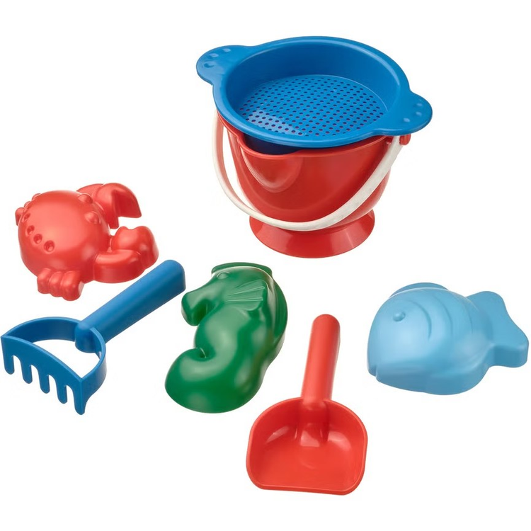محتویات بسته: سطل (bucket)، الک/صافکننده (sieve / strainer)، بیلچه (spade)، شنکن (rake) و ۳ قالب برای شکل دادن به شن (sand moulds).